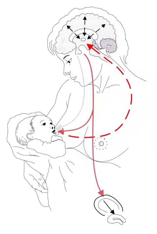 宝宝吸吮乳房的时候,乳头乳晕上的神经末梢会受到刺激,信号通过神经系统传递给下丘脑,促使垂体前叶释放更多的催乳素,垂体后叶分泌催产素。催乳素负责乳腺腺泡生产乳汁,催产素刺激肌上皮细胞挤压腺泡将奶挤出去,这样宝宝就能吃到奶了。