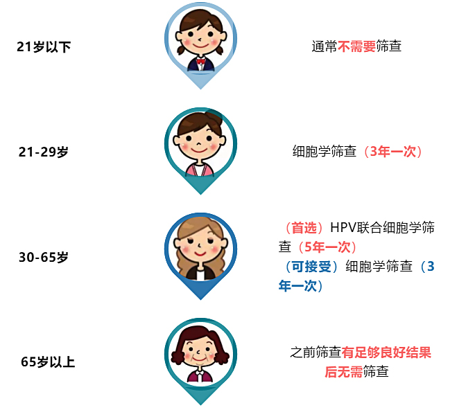 30-64岁:每5年一次HPV和细胞学联合检查,也可以采用每3年一次细胞学检查,不推荐只行HPV检查。