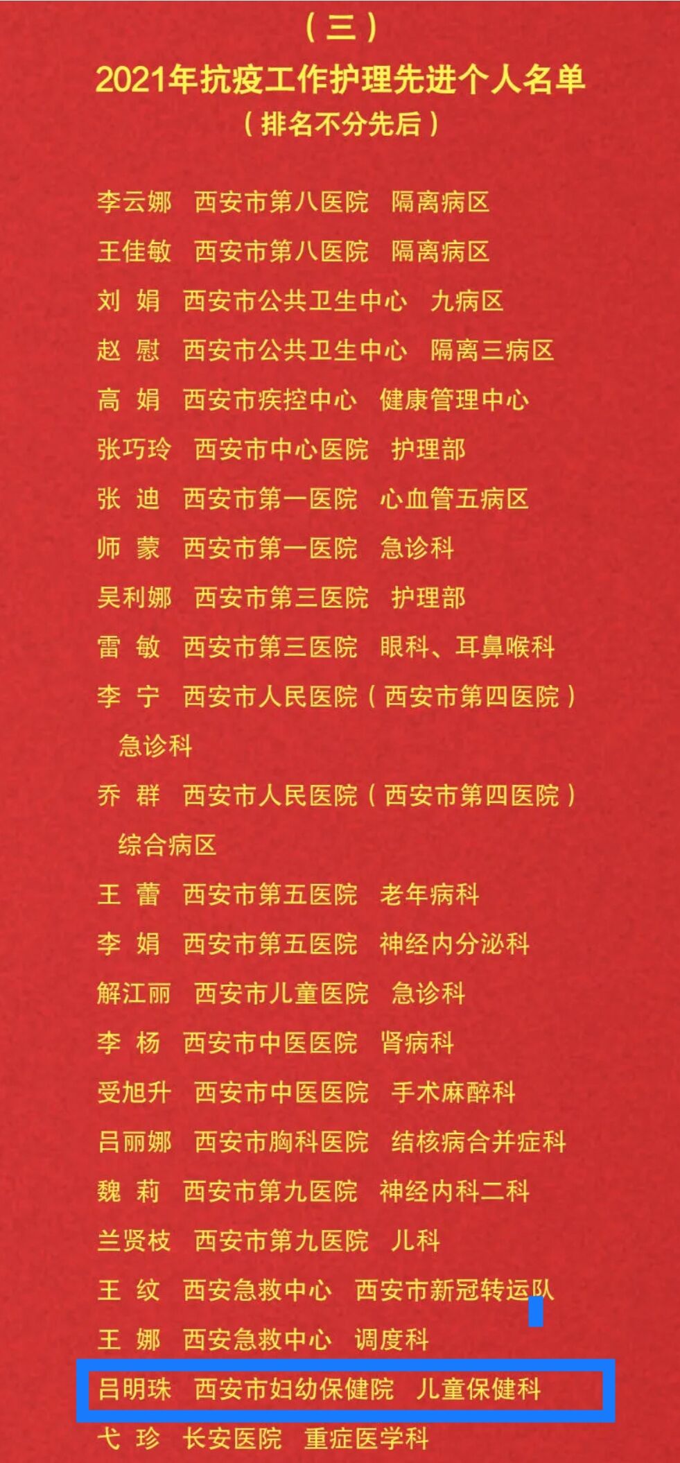 为庆祝第110个国际护士节,弘扬南丁格尔精神,激励护理工作者全心全意为人民服务的工作热情,在5月12日西安市卫生健康委员会举办的“千年古都 礼赞天使”5.12国际护士节文艺晚会上,红宝石官方网站hbs备用妇女保健科荣获“优质护理先进集体”、儿保科护士长吕明珠荣获“抗疫工作护理先进个人”、护理部干事魏娜荣获“优质护理先进个人”。红宝石官方网站hbs备用全体护理人员将继续凝心聚力、团结一致、再接再厉,为推动妇幼事业改革和发展再创佳绩,与医院同心前行,更好地保障妇女儿童健康做出新的更大的贡献!