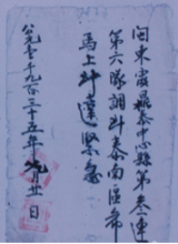 所谓“六面”密印,其实是五面刻花,花纹类似于星星,大大小小一共有八颗,有一面虽然四周有花纹,但中间是空白的。一张扣了密印的信函,上面有这样一行字。 “闽东霞鼎泰中心县第三连第六队调到泰南区,希马上到达。紧急。公元一千九百三十五年九月二十一日。”