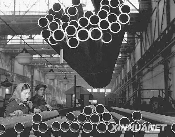 我国第一座无缝钢管厂——鞍钢无缝钢管厂大批新制好的无缝钢管正被吊运输送出厂。(资料照片 新华社发)