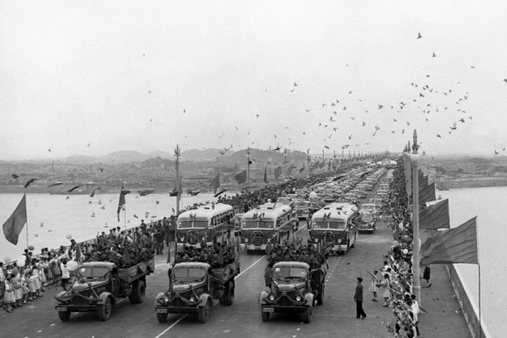 1957年10月15日,中国第一座跨越长江的大桥——武汉长江大桥举行通车典礼,从此南北天堑变通途。武汉长江大桥是我国第一个五年计划的重点建设工程之一,正桥为铁路公路两用,长1155.5米,连同两端公路引桥总长1670.4米。这是1957年10月15日,中国第一座跨越长江的大桥——武汉长江大桥举行通车典礼。(资料照片 新华社发)