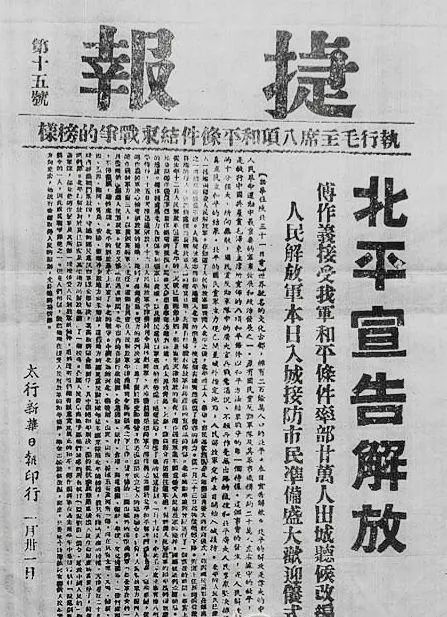 1949年1月31日,太行《新华日报》印发的北平宣告和平解放的捷报。