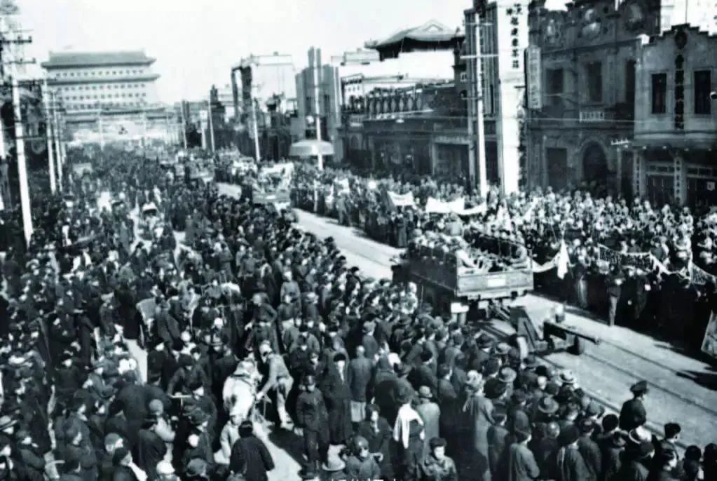 2月3日上午10时起,人民解放军举行盛大的北平入城式。虽然天寒地冻,但大街小巷挤满了人,北平的市民手执旗帜,高呼口号,欢迎解放军进城。