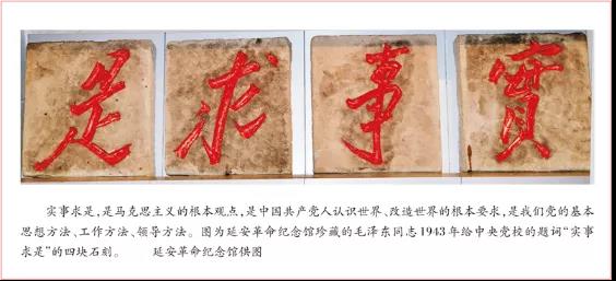 延安革命纪念馆有四块镇馆之宝,就是毛泽东同志在1943年给中央党校的题词“实事求是”的四块石刻,每块石刻长70厘米、宽63.5厘米、高14.5厘米。