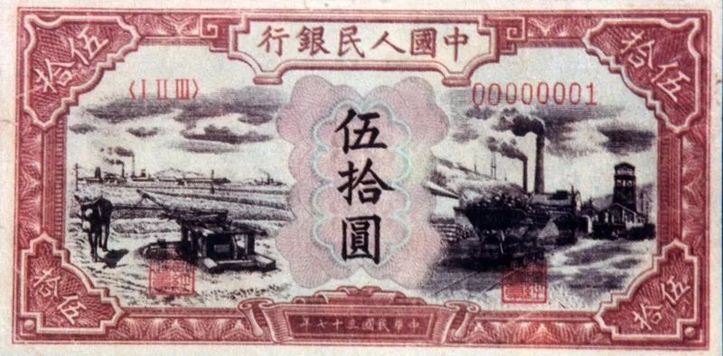 1948年12月1日,中国人民银行发行第一套人民币,“中国人民银行”六个字由当时的华北人民政府主席董必武同志题写。第一批发行的人民币有10元、20元和50元三种券别,首先在华北、山东和西北三大解放区流通使用。图为50元一号人民币。西柏坡纪念馆供图