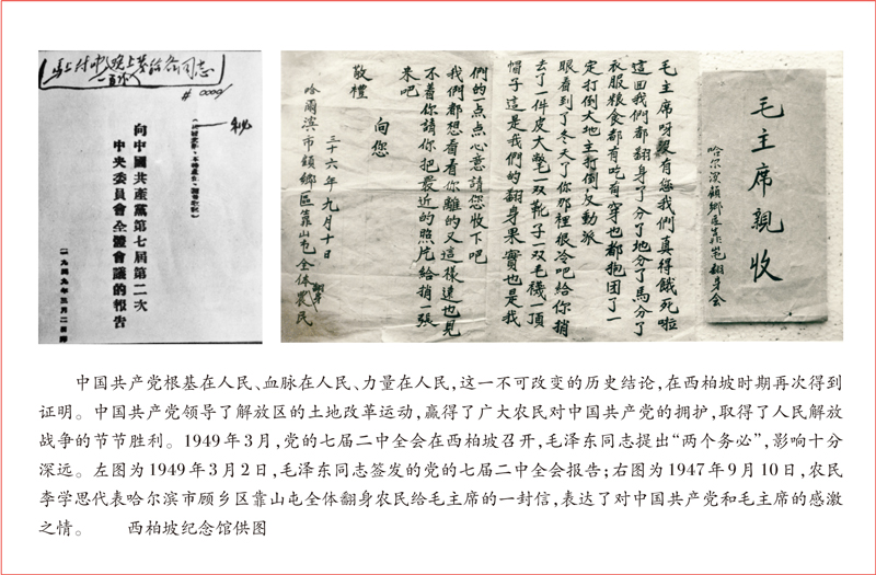 ——彰显为了人民、依靠人民的人民情怀。中国共产党根基在人民、血脉在人民、力量在人民。展览中展示了这样一封书信,信中写道:“毛主席呀,没有您我们真得饿死啦。这回我们都翻身了,分了地,分了马,分了衣服、粮食,都有吃有穿,也都抱团了……”这封信是东北翻身农民写给毛主席的,已经成为我们党一切为了人民、一切依靠人民的历史见证。全国土地会议景观、参加全国土地会议的部分人员名单、部分代表在土地会议上的发言稿、老农民在土墙上书写的《中国土地法大纲》照片、“土地回老家”锦旗……众多展品生动诠释了党在西柏坡的历史,就是全心全意为人民服务的历史。支前民工的立功喜报,用过的推车、纺线车,“运粮先锋”的奖旗……人民群众踊跃参军参战、缴粮支前,为人民军队提供了源源不断的人力物力,大大加快了解放战争胜利和新中国建立的步伐。党为了人民、依靠人民的文物、史料和真实记录,可以启迪干部群众深切感受到,党始终坚持全心全意为人民服务的根本宗旨,人民群众的拥护和支持是我们党最坚实的根基。