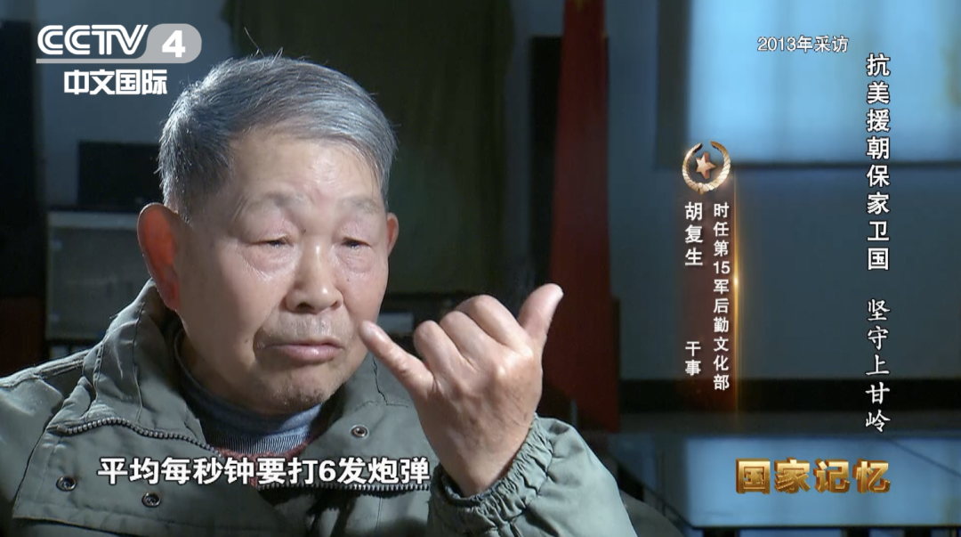 时任第15军后勤部文化干事胡复生:那个炮弹密度很大,平均每秒钟要打6发炮弹,那炮弹一个接一个,土都全部打松,表面工事全部没有了。