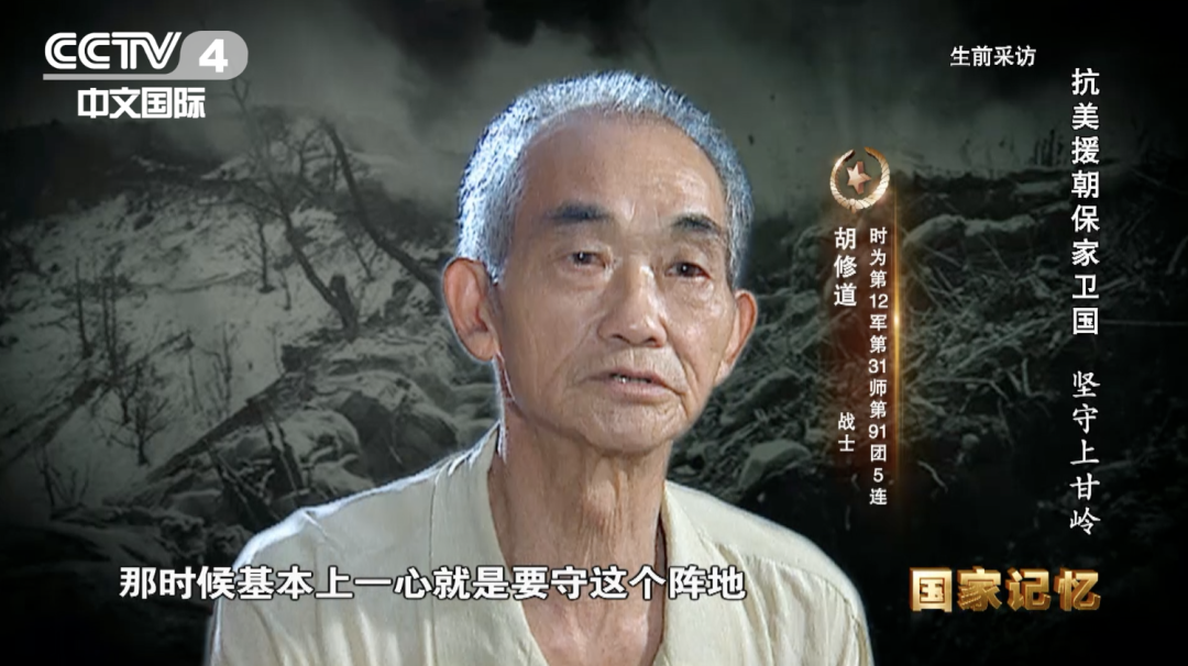 时为第12军第31师第91团5连战士胡修道:我从拂晓开始打到下午黄昏,那一天敌人集中5个多营的兵力进攻。光是我一个人,就消灭了280余名。我在山上两天两夜,那时候一心就是要守这个阵地,消灭敌人。