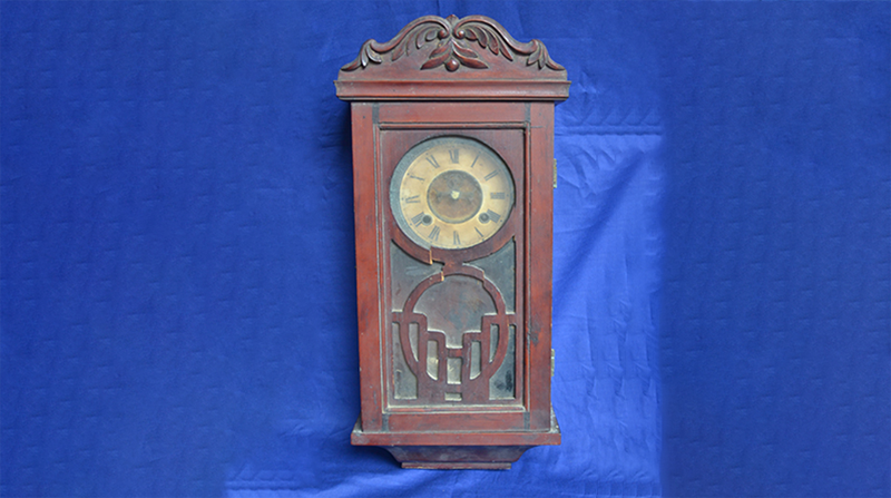 遵义会议的会议室东墙上有个挂钟,长50厘米、宽22厘米、厚11厘米,是一架自鸣木壳机械摆钟,刻度为罗马数字,钟顶饰有变形植物图案木雕,底部为倒梯形木座,钟面有玻璃门,门的四周有木质雕花边框。
