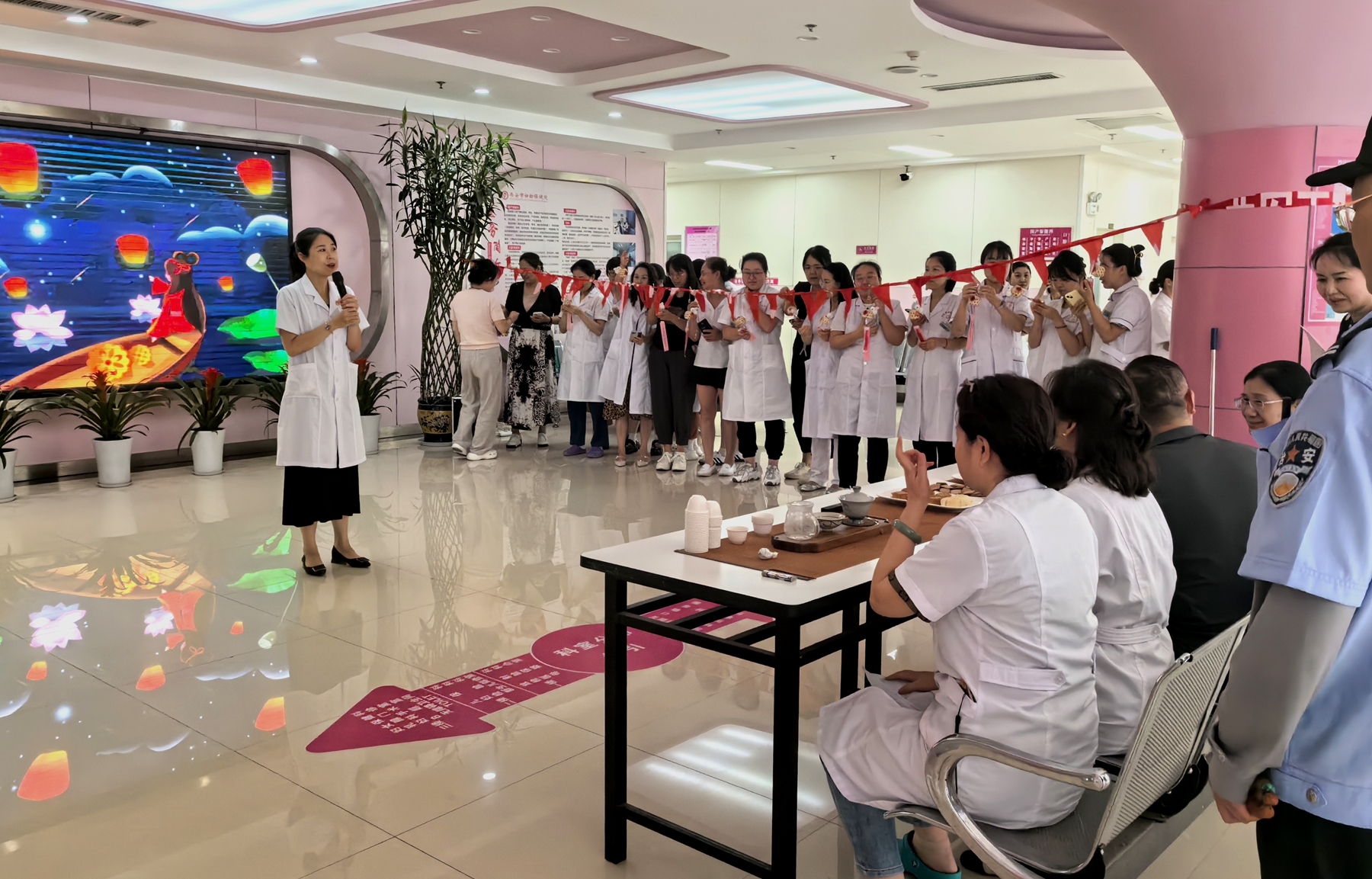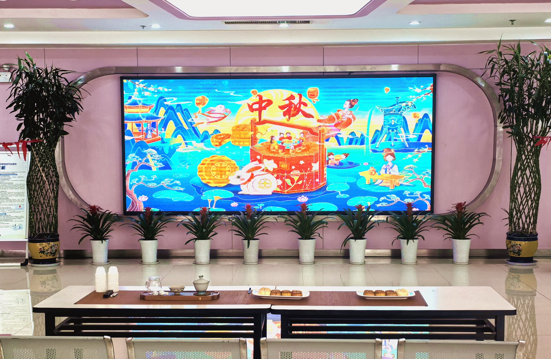 现场装饰着彩带,悬挂了特色竹编小灯笼,还设有品赏台,准备了美味的月饼、零食及香茗,吸引了众多患者与家属观看。