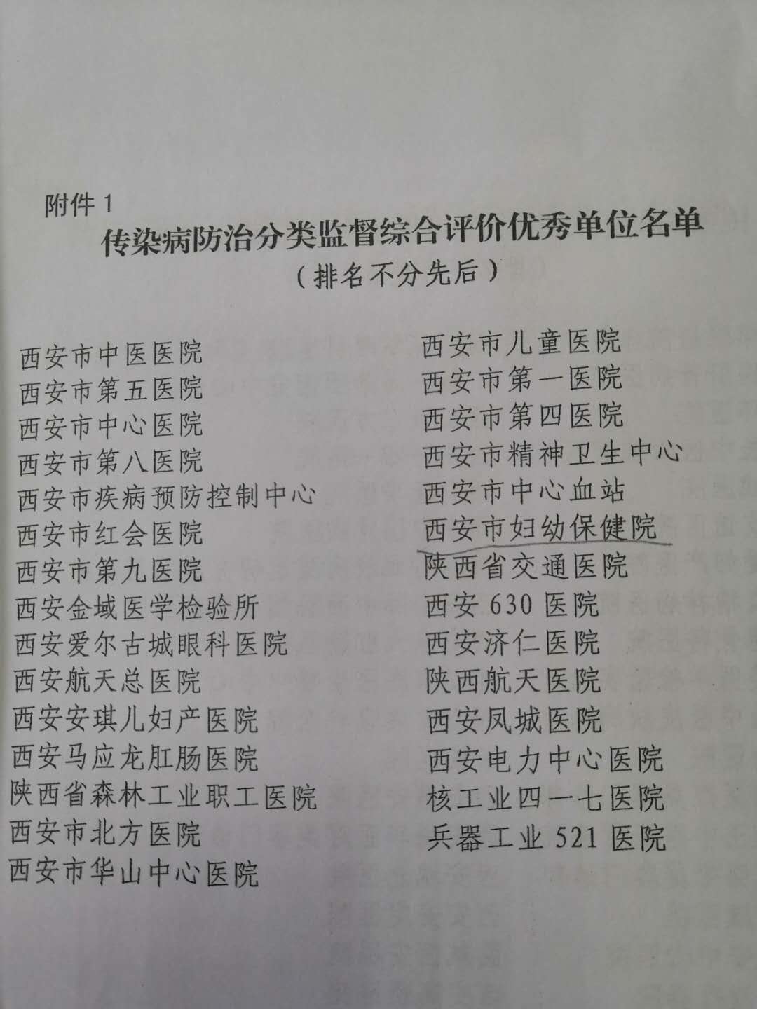 2018年西安市卫生监督所对市管医疗卫生机构开展了传染病防治分类监督综合评价工作。主要检查项目包括传染病综合管理、预防接种管理、法定传染病疫情报告、传染病疫情控制、卫生消毒、医疗废物处理、病原微生物实验室生物安全管理等。对72家医疗卫生机构进行综合评价,其中29家为优秀单位,我院荣获优秀单位称号。