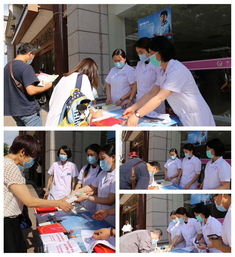 医务人员向过往行人发放“保护青少年-远离传统烟草和电子烟”宣传海报、毛巾、围裙、妇幼保健书籍等宣传用品,向就医的患者于过往的行人传递控烟理念和相关知识。同时,在一楼门诊大厅显示屏上动态播放控烟宣传标语、海报及视频。