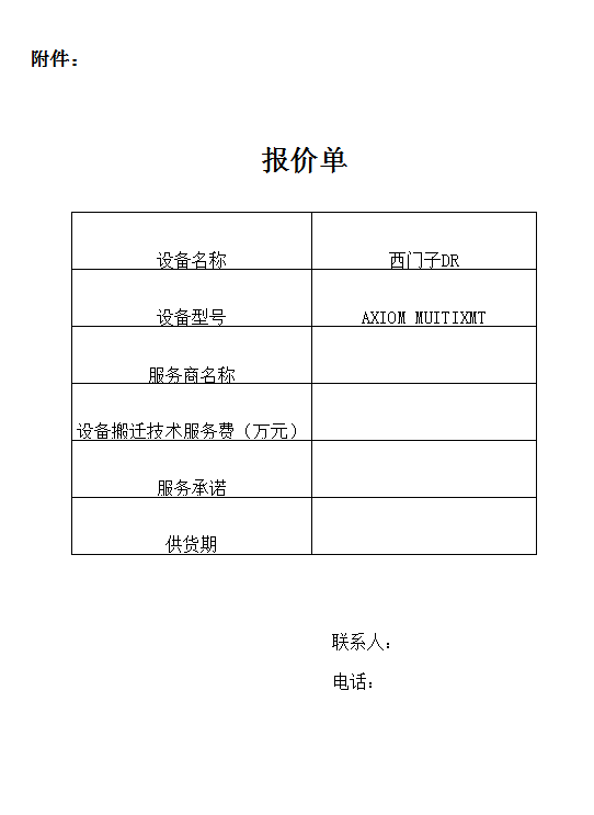 根据市财采计[2017]7861号批准同意我单位以分散采购形式完成DR设备拆装搬移项目。该项目服务内容包括:设备的整机拆卸(地点:塘坊街西安市第二医院)、包装、运输、安装(地点:待定)、调试。此项目招标评分方法为综合评分,评分标准如下:1.资质 10分;2.价格 50分;3.服务承诺 30分;4.服务期 10分。凡有意参与此项目投标的服务商,请于五个工作日内,将公司经营资料及报价单等资料(密封盖章投递有效)投递我院设备科。